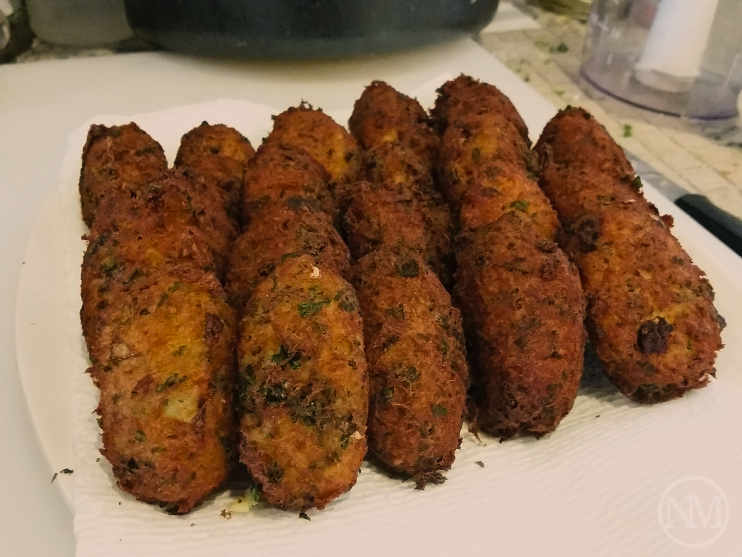 In a large bowl, add the cod, onion, parsley, mashed potatoes and beaten eggs. Mix thoroughly.(8) Using two tablespoons, shape the bolinhos into an egg or ball shape. Fry the bolinhos in vegitable oil at 375 degrees for a couple minutes on each side until golden brown. Finally place them on a plate lined with paper towel to drain off the excess oil and cool down a little bit.(9) They are best eaten fresh, enjoy!(10)