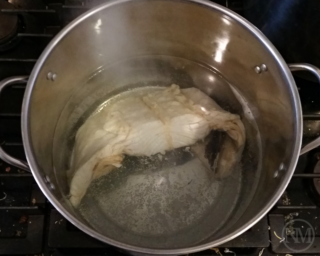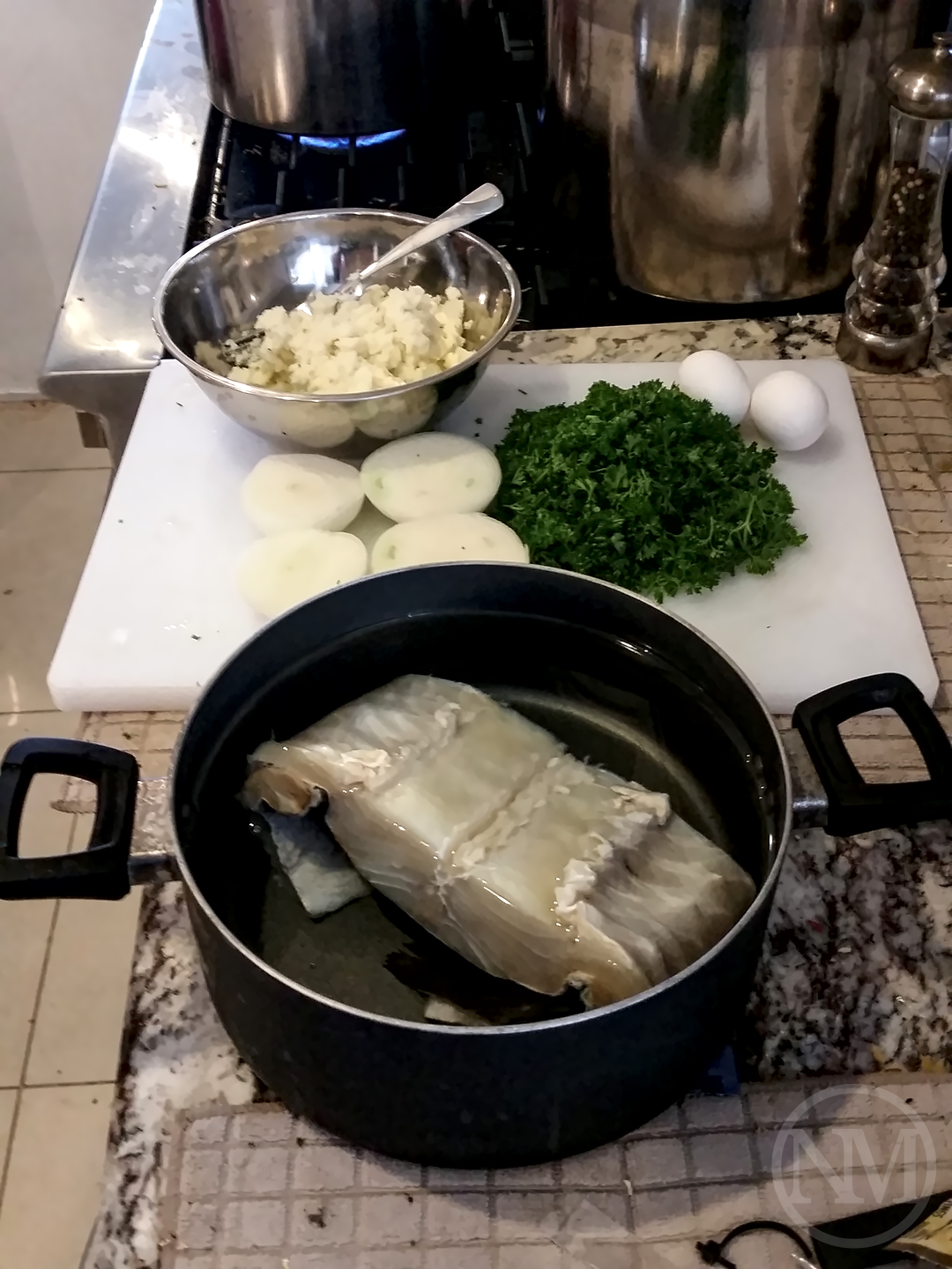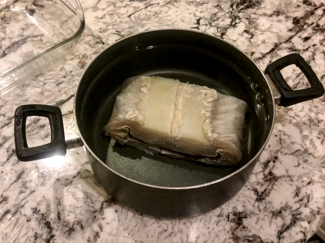 Soak the salt cod in water for at least 24 hours, changing the water 2 to 3 times.(1) Boil the potatoes with the skin for about 30 to 40 minutes. Remove them from the pot, let cool, then peel them. Mash the potatoes any way you want, I typically just use a fork.(2) Remove the cod from the soaking water.
